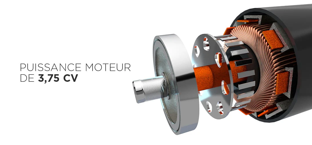 Motorisation : Moteur puissant et silencieux de 3,75 CV en pic, 2,5 CV en continu.